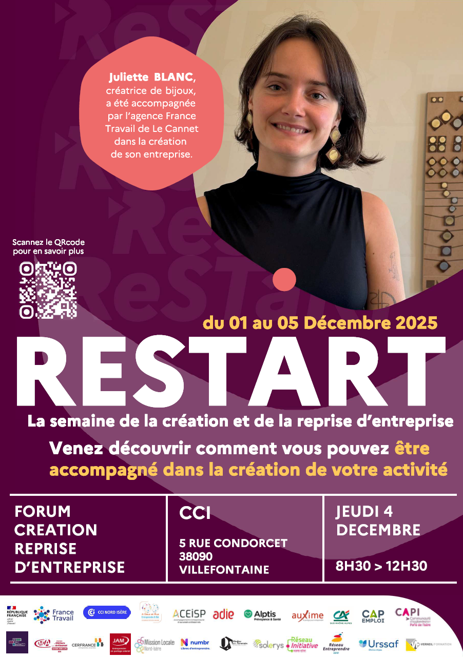 MARDI 4 DEC . 8h30-12h30 . VILLEFONTAINE Restart : forum de la création reprise objectifs : découvrir et échanger avec plusieurs professionnels de la création & reprise d'entreprise public : porteurs de projet et entrepreneurs >> Infos & inscription ICI (gratuit) [organisé par France Travail] |